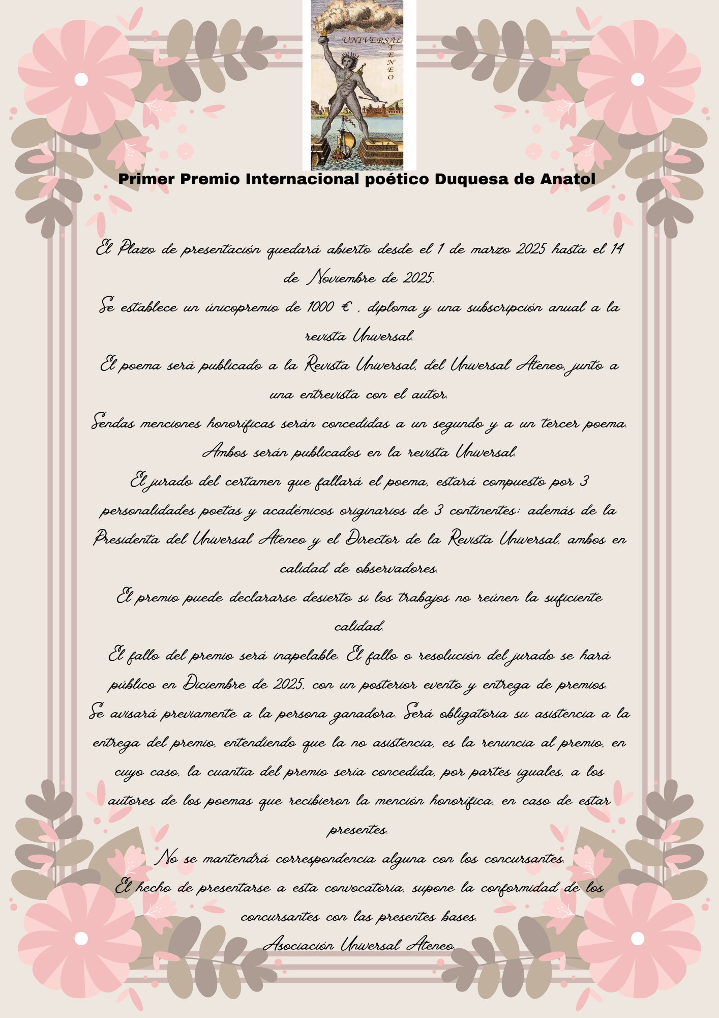 Doña Maria Gloria Esther Rubio Valido, Presidenta del Universal Ateneo, tiene el honor de invitarles al Décimo Recital de Poesía, 2024, que tendrá lugar el Viernes 20 de Diciembre de 2024, en la Sede de Universal Ateneo a las 18:30 horas.